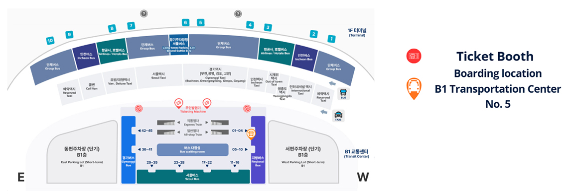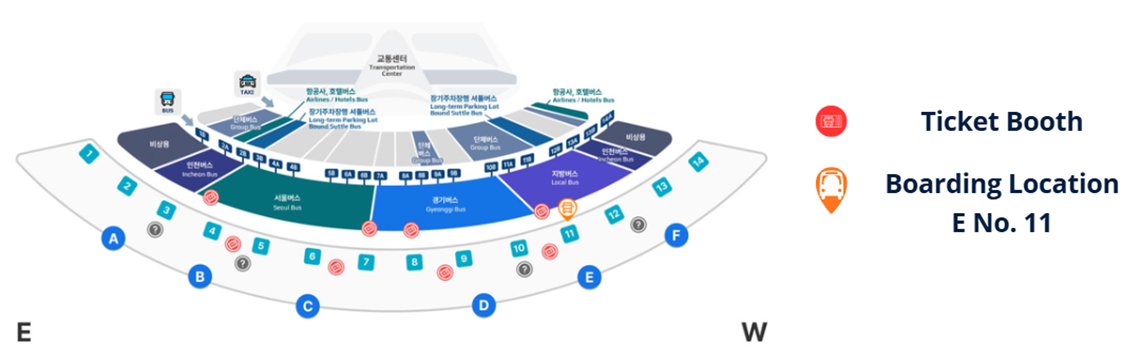 Tickets to Daejeon can be purchased at the Ticket Booth between Exit 4, 6, 8, 10 at Terminal 1 and at the B1 floor Transportation Center for Terminal 2 as indicated in the images below. The arrival terminal should be ‘Daejeon Complex Bus Terminal – 대전복합터미널’. When you buy your ticket, be sure to ask for the seat number. Most ticket sellers speak some English and each ticket is for a specific seat on the bus. The seat number is also printed on the ticket.